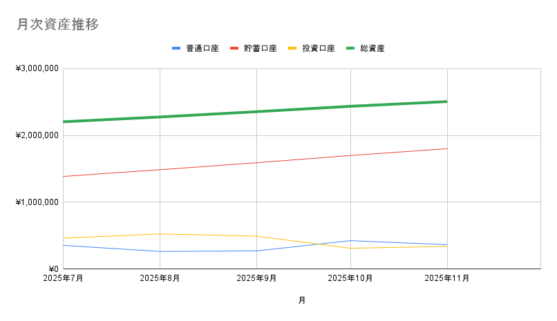 今月のように旅行で支出が多かった月でも、この貯蓄口座の安定感が総資産のプラスに大きく貢献してくれました。